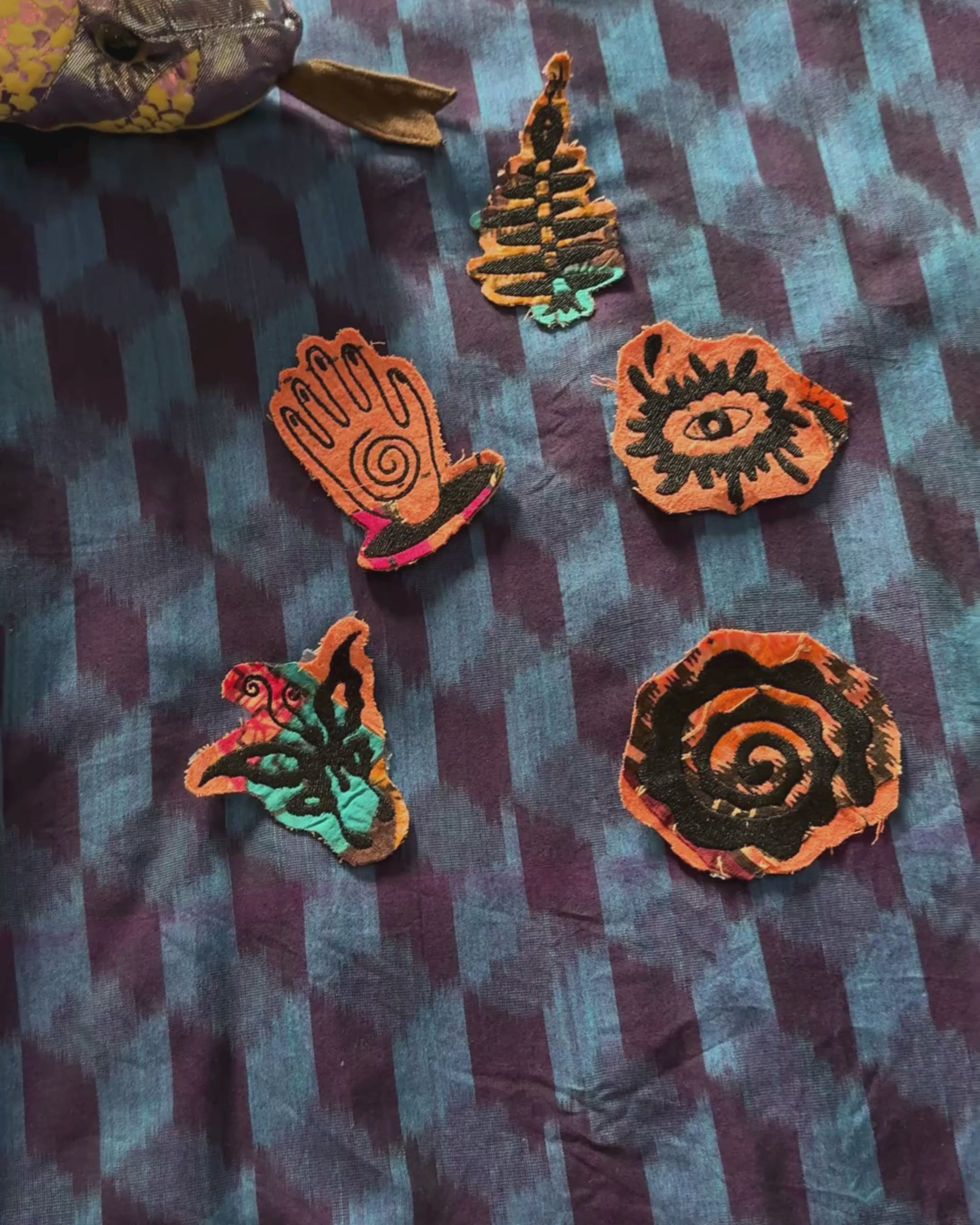 We’ve collaborated on a beautiful mix of Shreya's tattoos designed by her as symbols on hand-made appliquéd textiles from Acid Moons, leftover from our production that hold the beautiful art of upcycling using bedspreads & a running hand stitch called kantha, making the ✨ symbol magic ✨ live not just on skin but also on the clothes you love.